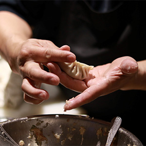 キャベツ、白菜、玉ねぎ、ニラを季節にあわせて水分量を調整し、手作業で肉と野菜を合わせていきます。うす皮を楽しんでいただけるように、出来立てをすぐに生冷凍しております。